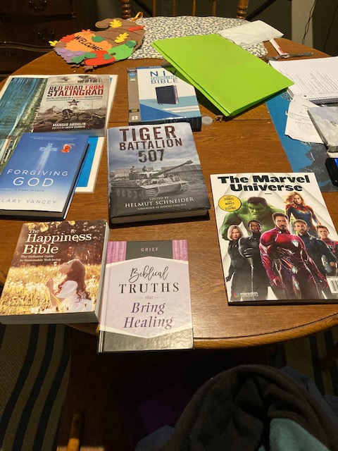 On the one hand, there are books about the Bible covering the table. The Detective Mom in me reads the titles and worries that her little guy is still struggling with grief and depression. He spends so much of his day alone. Does he still need healing, forgiveness, to find happiness? Of course, most all of us struggle with those demons on a daily basis. Am I reading too much into this?