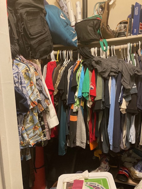 Wednesday the closet was installed, taking most of the day for completion. When it was done, we went up to his apartment to help him sort his clothing, put everything on hangers and cull anything that no longer fit or that he no longer wore. That took several hours. Luckily, we hit upon the fact that sizes small and medium no longer fit him. It was easy for Bryan to separate and let go of those shirts once that was established. We came home with two garbage bags full of unworn, torn or ill-fitting clothing. This made more room for the stuff he really wears.