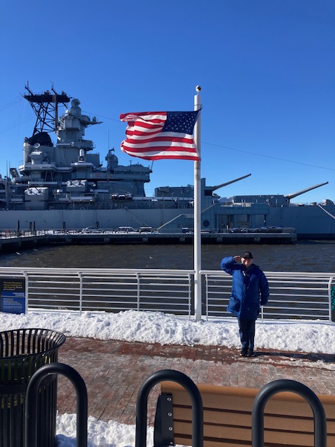 Walking the snowy main deck finished off the tour with Bryan saluting the ship and the flag outside before the boys headed back up north on I 95.