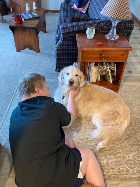 We had just returned home after our annual trip to the Middletown Grange Fair. It was a choreographed move on our part, unbeknownst to Bryan. We set up the goodbye session knowing that the next day, our dearest Golden Girl, Coda, would cross the Rainbow Bridge at our home. Bryan still is unaware that we had to put her to sleep. He knows she passed away. That is enough for him to grasp. Bryan seemed to know that she wasn’t doing so well as he talked to her, petted her and comforted her as she lay on her pad in the kitchen. We let them alone together for about ten minutes, then took Bryan back to his apartment.