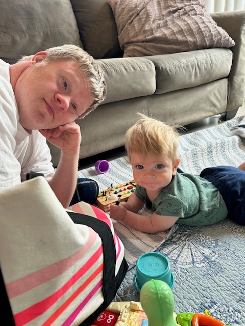 As seen in the photos, Bryan liked to play with the baby in the play area we created on the floor, trying to figure out some of the toys which both boys had mastered through repetition. It was interesting to note the fine motor skill his older nephew exhibited, but which eluded Bryan as a 43-year-old.