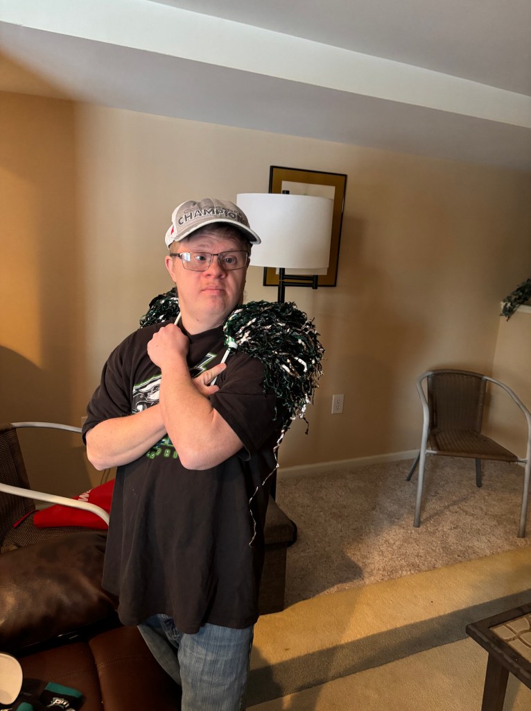 Each January post-season Eagles game was watched in eager anticipation by Bryan. After church, we would come back to our temporary home, have lunch together, and sit down with nervous energy bouncing off the walls as Bryan prepared the space prior to kickoff. The room where we watch TV transformed into “Eagles Central”. The decorating items were hauled to church in a huge bag, including a change of clothing for Bryan into Eagles gear. Once he was dressed in his regalia, out came the Pom-poms, Eagles beaded necklaces, hats, keychains, extra shirts, decals, socks, you-name-it, he has it! The stuff adorned every spare inch of the room including doorknobs and lamps.