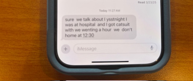 The text came this morning. Trying to translate it with my husband, we hit upon the words “hospital” and “catsuit” – aka “cat scan”? Alarming for sure.