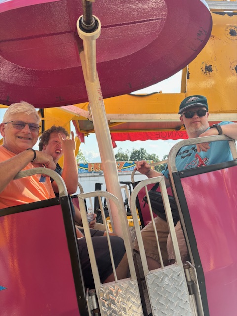Next up was the Ferris wheel. Another struggle for Sean. It warmed my heart to see Bryan, on one of the revolutions, lean over and pat Sean’s hand for reassurance when he began to get anxious suspended high in the air over the fairgrounds. Comforting his new-found friend. Sean was rather proud of himself for completing the ride without incident.